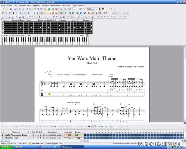 - Виртуальный гитарный гриф и клавиатура пианино, на которых отображаются ноты, проигрываемые в текущий момент. С помощью них также можно создавать и редактировать гитарные партии;