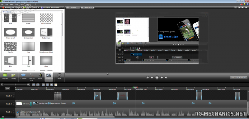 Camtasia Studio - мощная утилита для записи изображения с экрана в видеофайлы различных форматов, имеется возможность редактирования видео, есть встроенные Macromedia Flash (SWF) и видео проигрыватели. Camtasia захватывает действия и звуки в любой части Windows-систем и сохраняет в файл стандарта AVI. Сделанное при помощи программы видео можно экспортировать в один из поддерживаемых программой форматов - AVI, SWF, FLV, MOV, WMV, RM, GIF, CAMV. Кроме того, на основе любого видео может быть скомпилирован исполнительный exe-файл, который будет содержать встроенный проигрыватель. Camtasia Studio позволяет накладывать ряд эффектов, умеет работать с отдельными кадрами, облегчает запись, редактирование и публикование высокоточного, сжатого видео для тренировки, образования, дистанционного обучения, решений технической поддержки, демонстраций продукта, торговых презентаций и т.д.